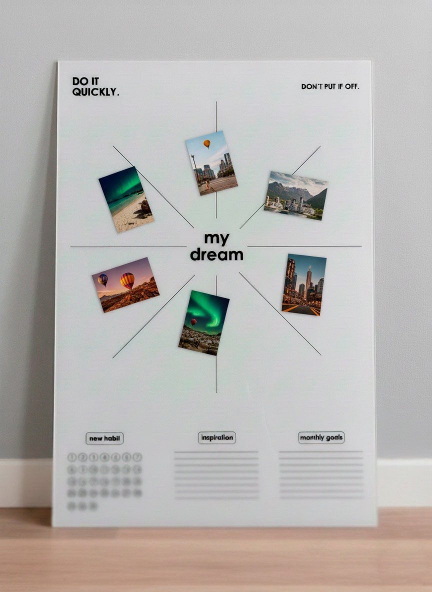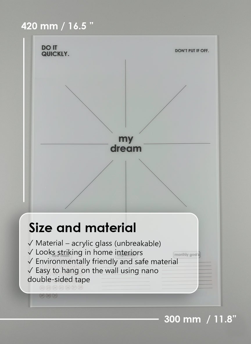 1 Acrylic vision board – transparent, reusable, and perfect for writing with a dry-erase marker and wiping clean with ease.